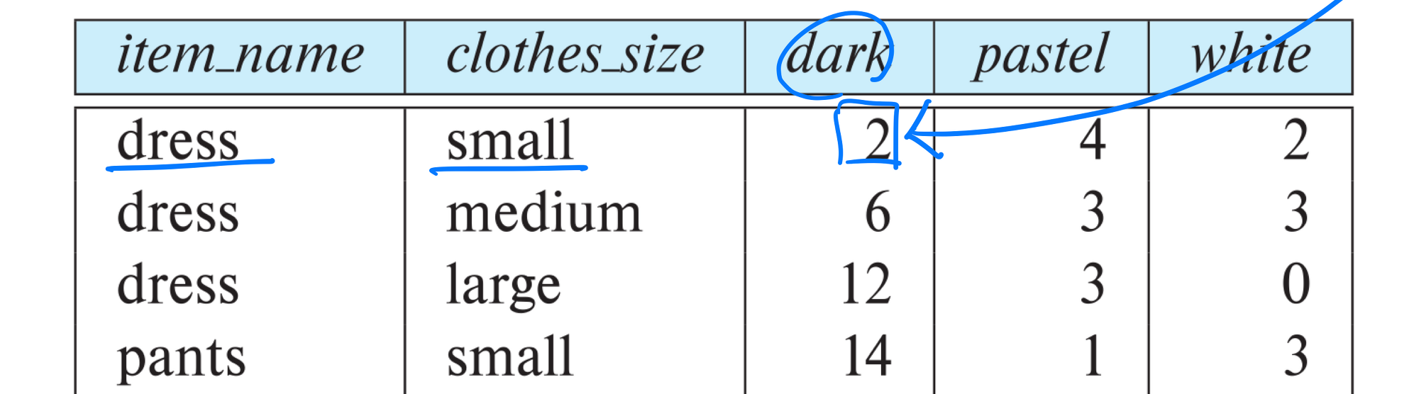 - select * from sales pivot( sum(quantity) for color in ('dark', 'pastel', 'white') );