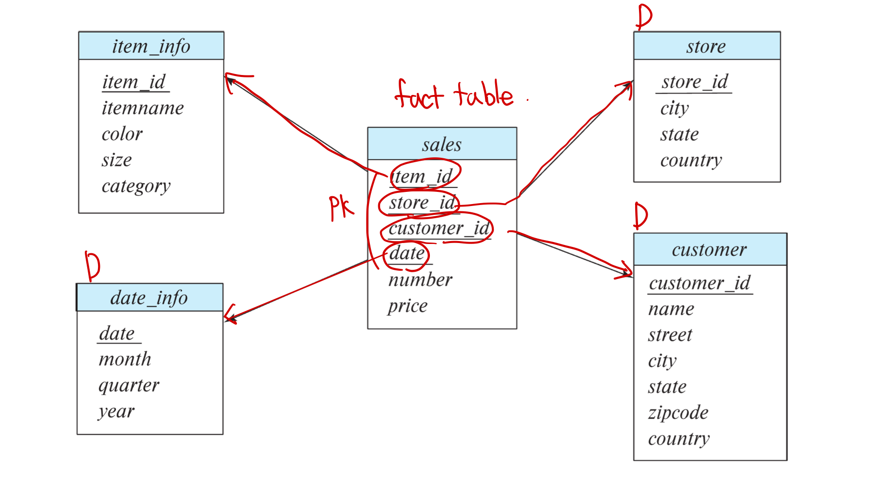 - 여러 dimension table의 PK를 속성으로 가짐, 그리고 이 속성들이 fact table의 PK가 됨