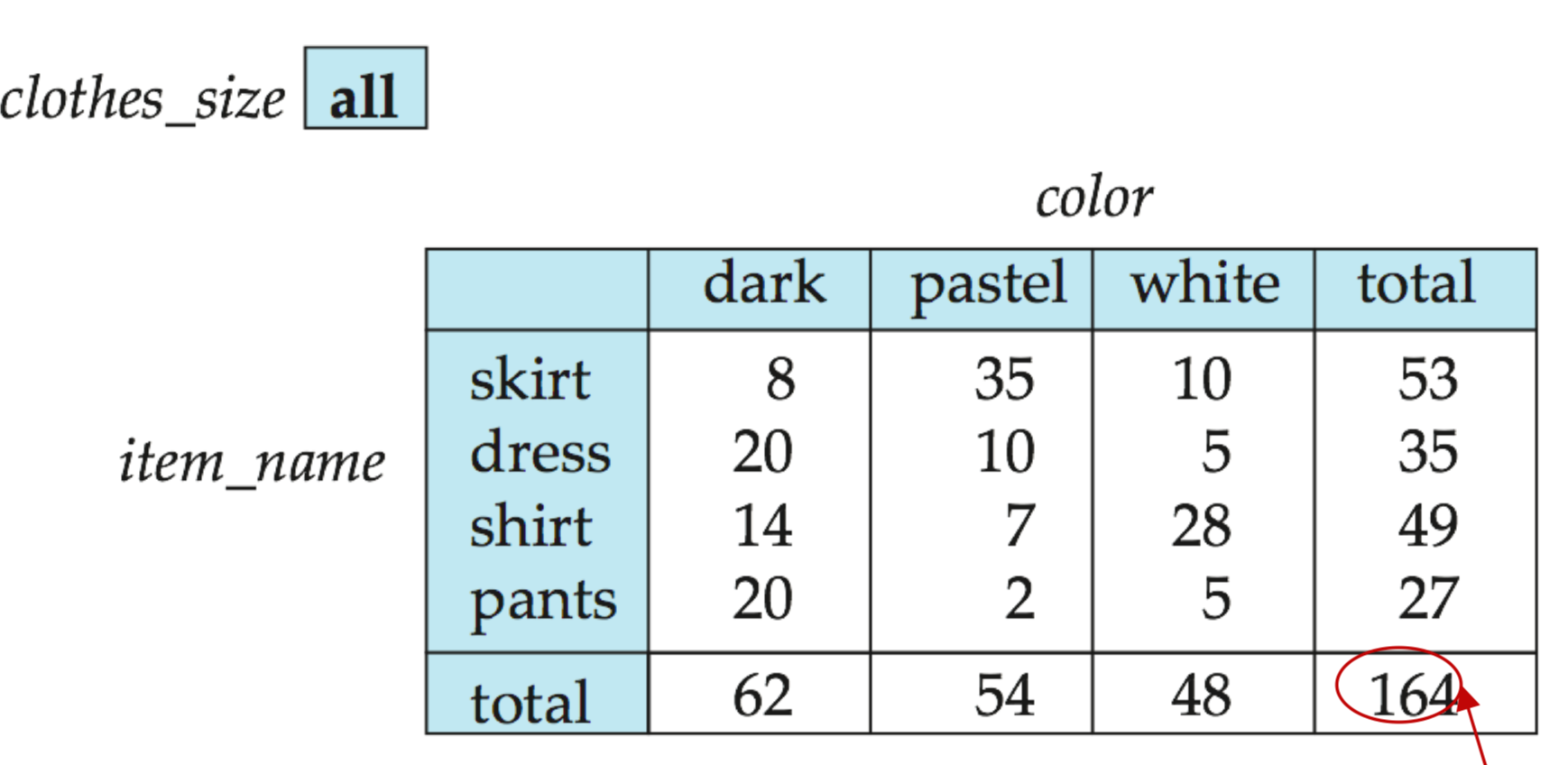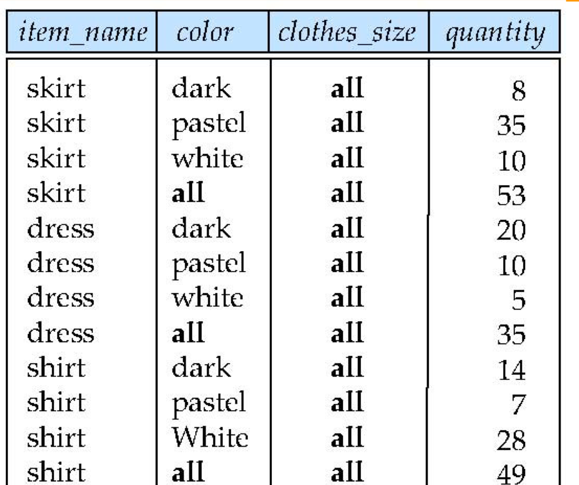 - select sum(quantity) from sales group by cube(color, item_name)