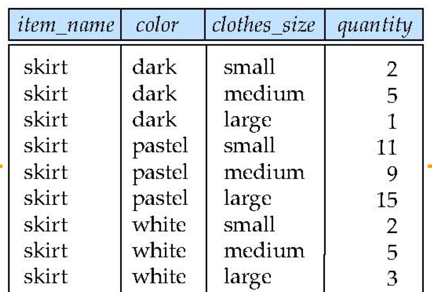 - saels(item_name, color, clothes_size, quantity)