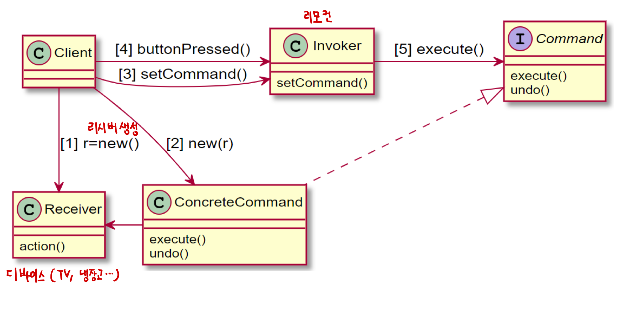 - Invoker : 리모컨 버튼을 누르면 기능을 실행함