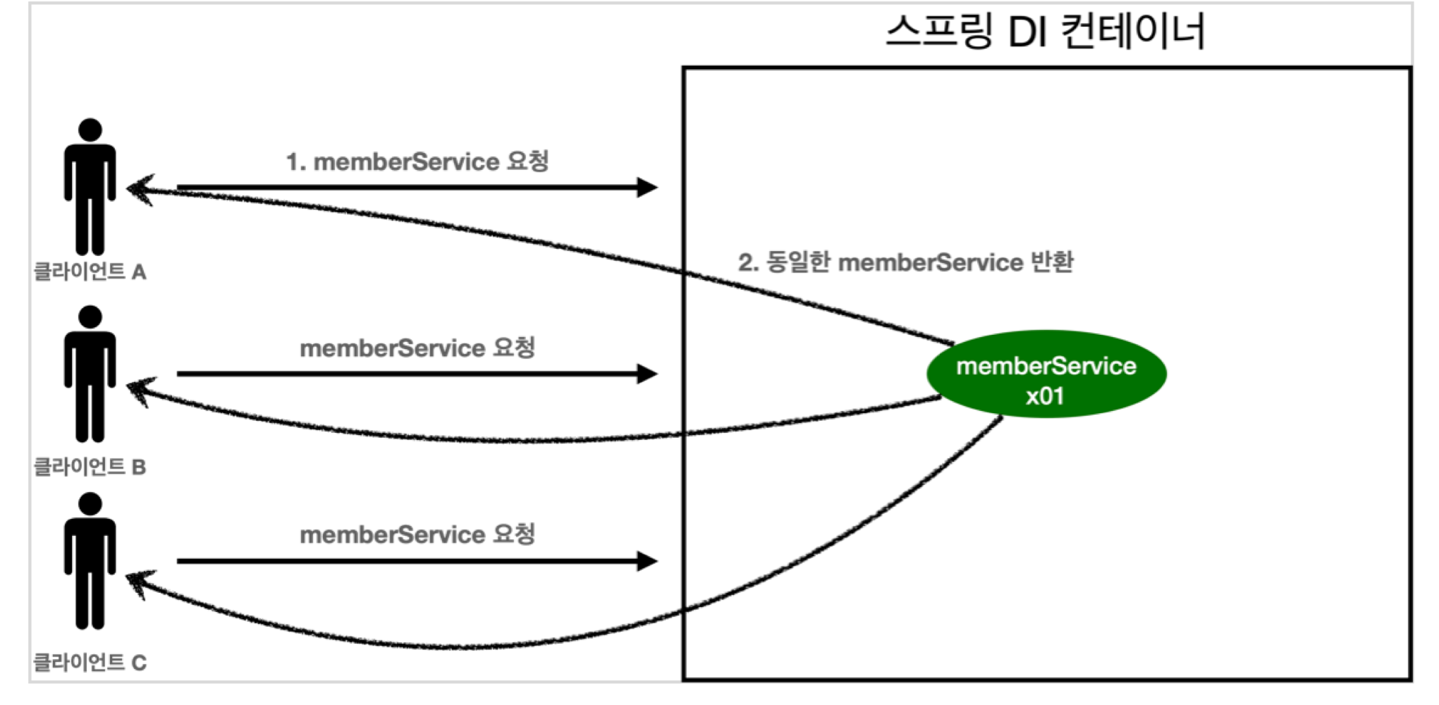 - 이는 어떤 객체를 생성할 때, 객체가 빈에 등록됐는지 안됐는지 먼저 확인하고 싱글톤을 보장한다.