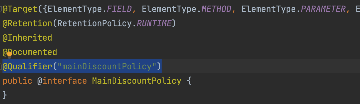 그리고 Qualifier를 사용할 때는 @Qualifier("mainDiscountPolicy") 대신 @MainDiscountPolicy를 붙여주면 된다.