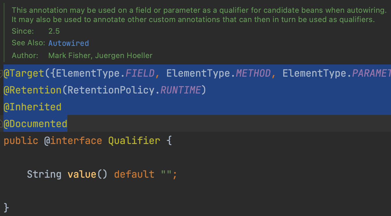 qualifier 어노테이션을 들어가보면 위와 같이 구성돼있는데, 블록친 부분을 가져와서 직접 특정 Qualifier를 만들 수 있다.