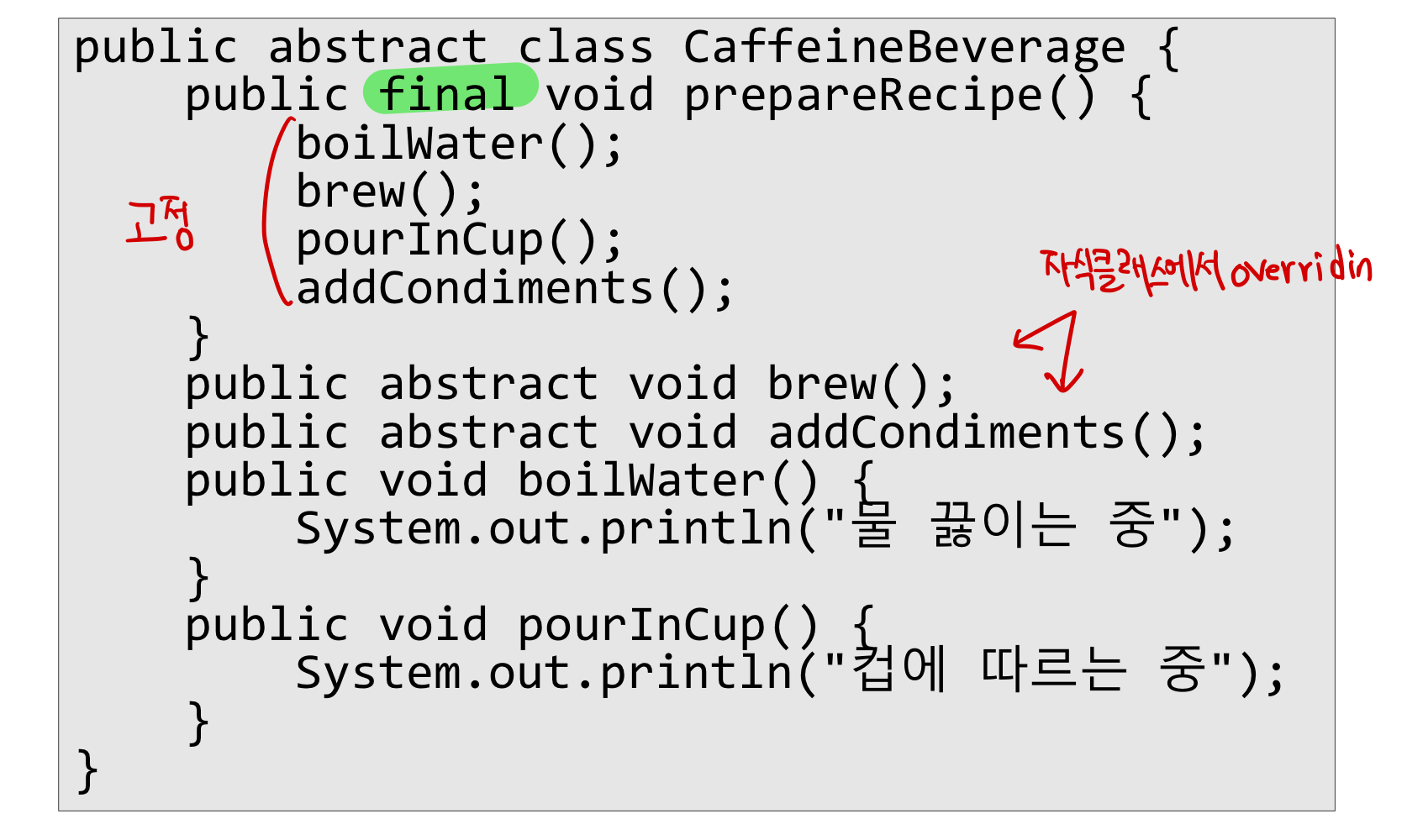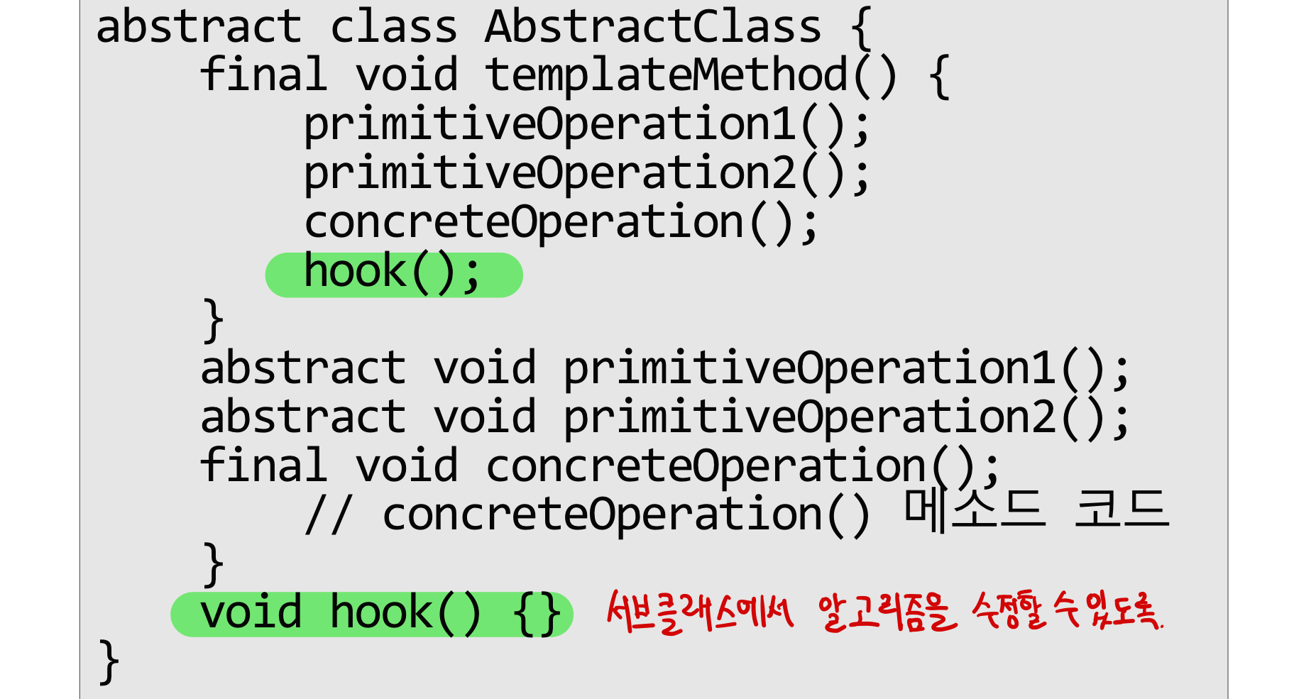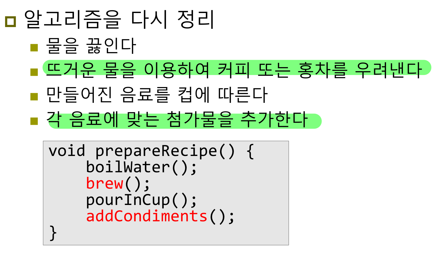 서브클래스에서 수정할 수 있도록 한다. -> 알고리즘의 한 부분을 선택적 구현