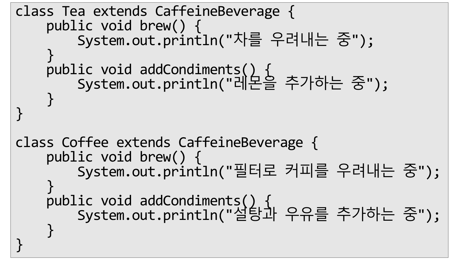 해결 : 알고리즘의 중복되는 부분을 부모 클래스에 캡슐화, 달라지는 부분만 서브 클래스에 구현