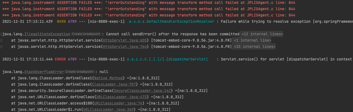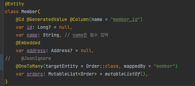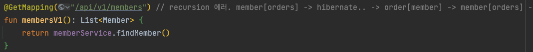 Servlet.service() for servlet [dispatcherServlet] in context with path [] threw exception [Request processing failed; nested exception is org.springframework.http.converter.HttpMessageNotWritableException: Could not write JSON: Infinite recursion (StackOverflowError); nested exception is com.fasterxml.jackson.databind.JsonMappingException: Infinite recursion (StackOverflowError) (through reference chain: com.example.jpashopkotlin.domain.Member["orders"]->org.hibernate.collection.internal.PersistentBag[0]->com.example.jpashopkotlin.domain.Order["member"]->com.example.jpashopkotlin.domain.Member["orders"]->org.hibernate.collection.internal.PersistentBag[0]->com.example.jpashopkotlin.domain.Order["member"]->com.example.jpashopkotlin.domain.Member["orders"]->org.hibernate.collection.internal.PersistentBag[0]->com.example.jpashopkotlin.domain.Order["member"]->com.example.jpashopkotlin.domain.Member["orders"]->org.hibernate.collection.internal.PersistentBag[0]->