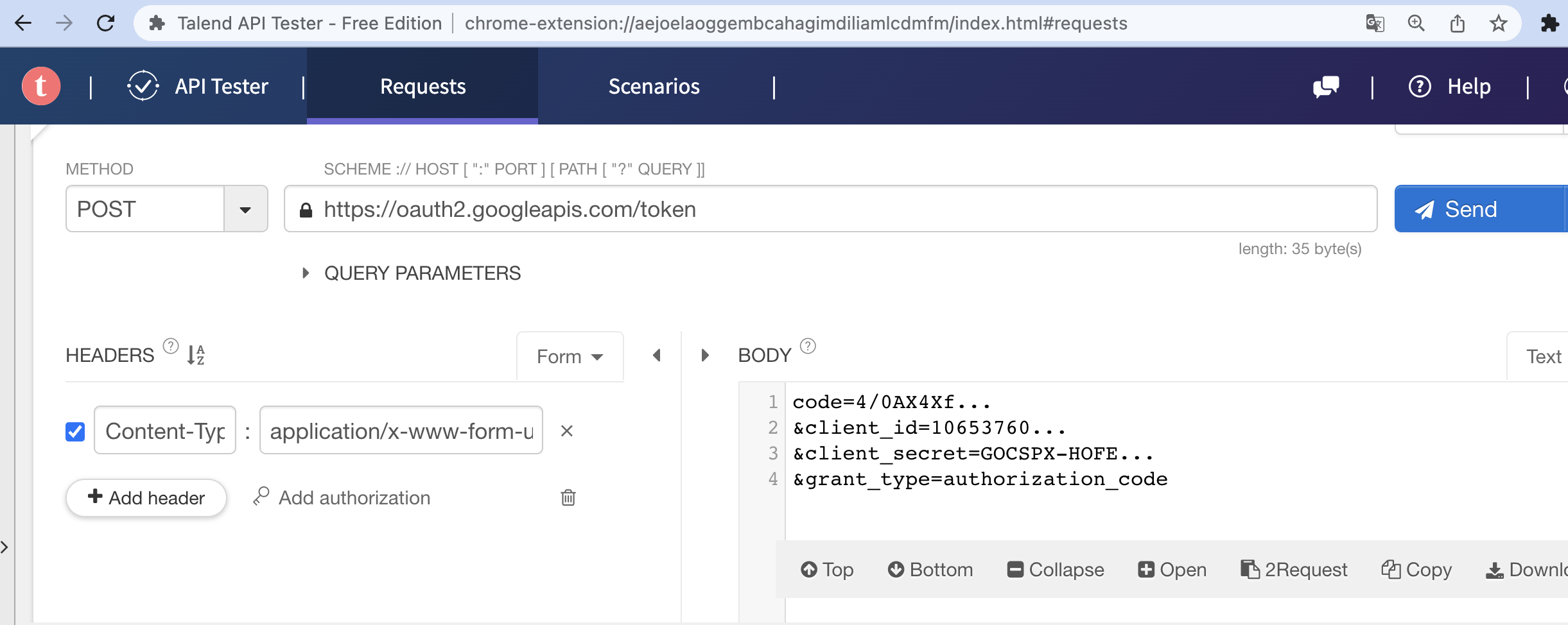 https://oauth2.googleapis.com/token 으로 POST 요청을 보낸다.