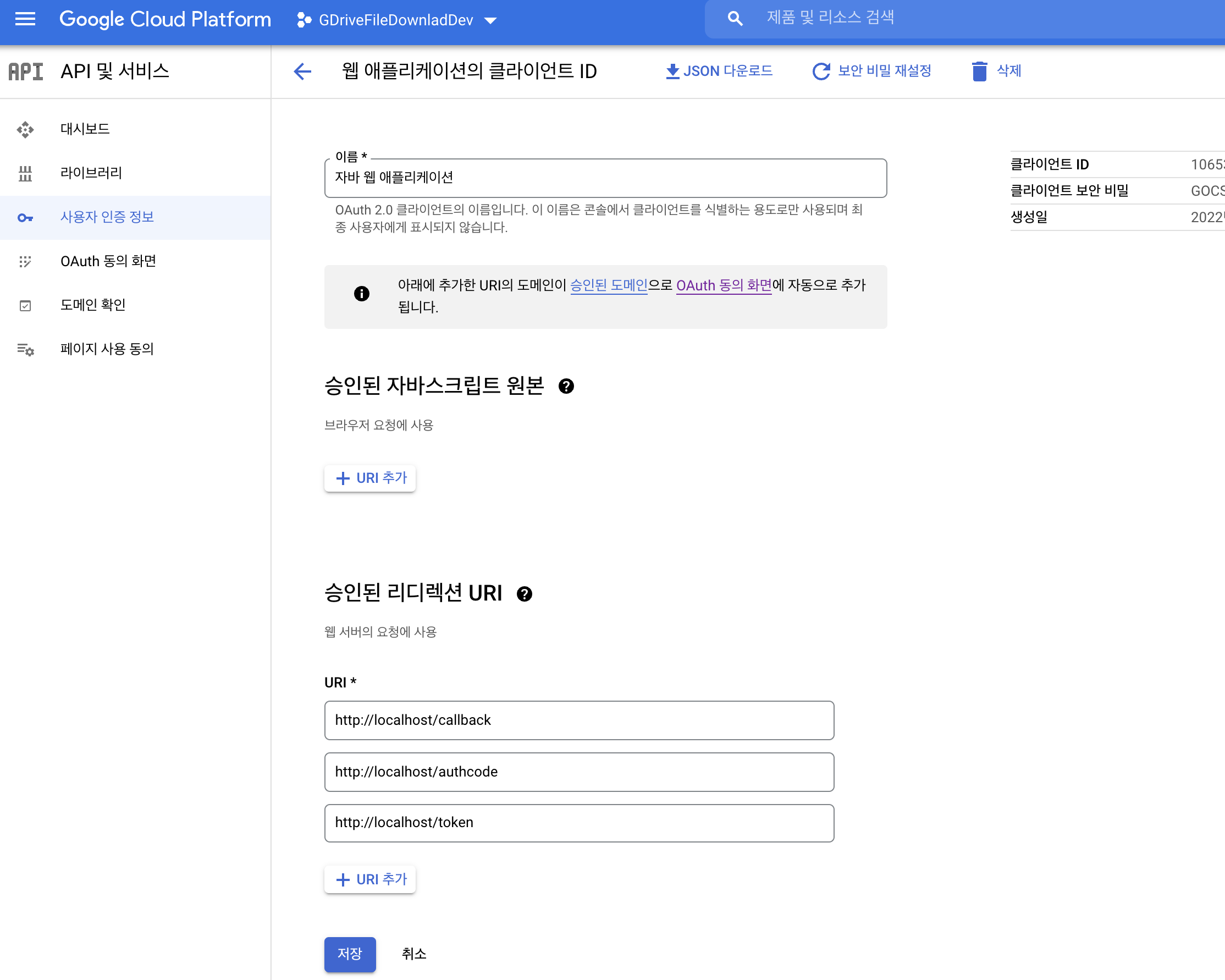 - oauth 클라이언트 다운로드 후 client_id, client_secret 가져오기.