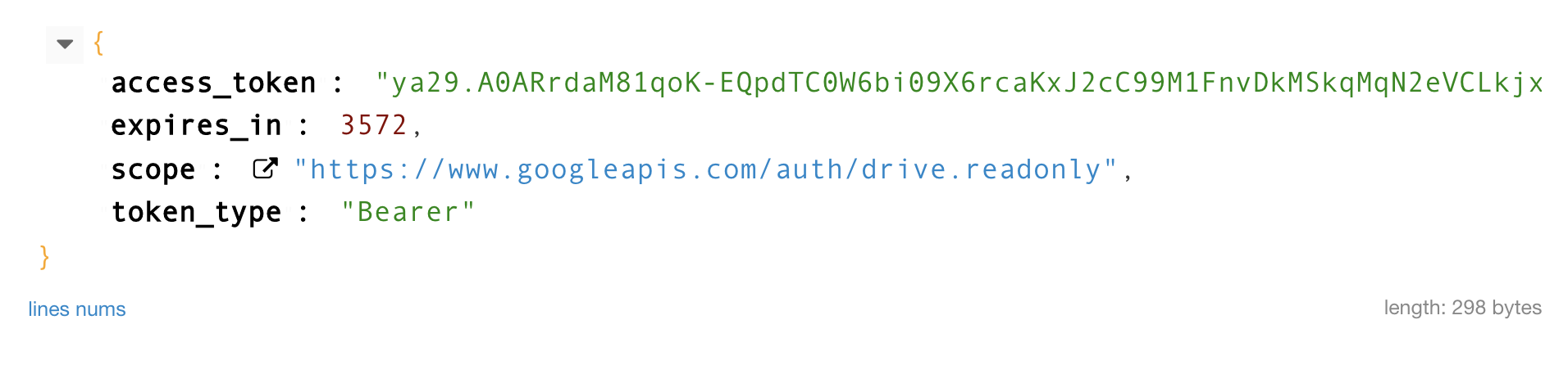 응답은 json 타입으로 온다. 발급받은 access_token으로 scope안의 구글 api를 사용할 수 있다.