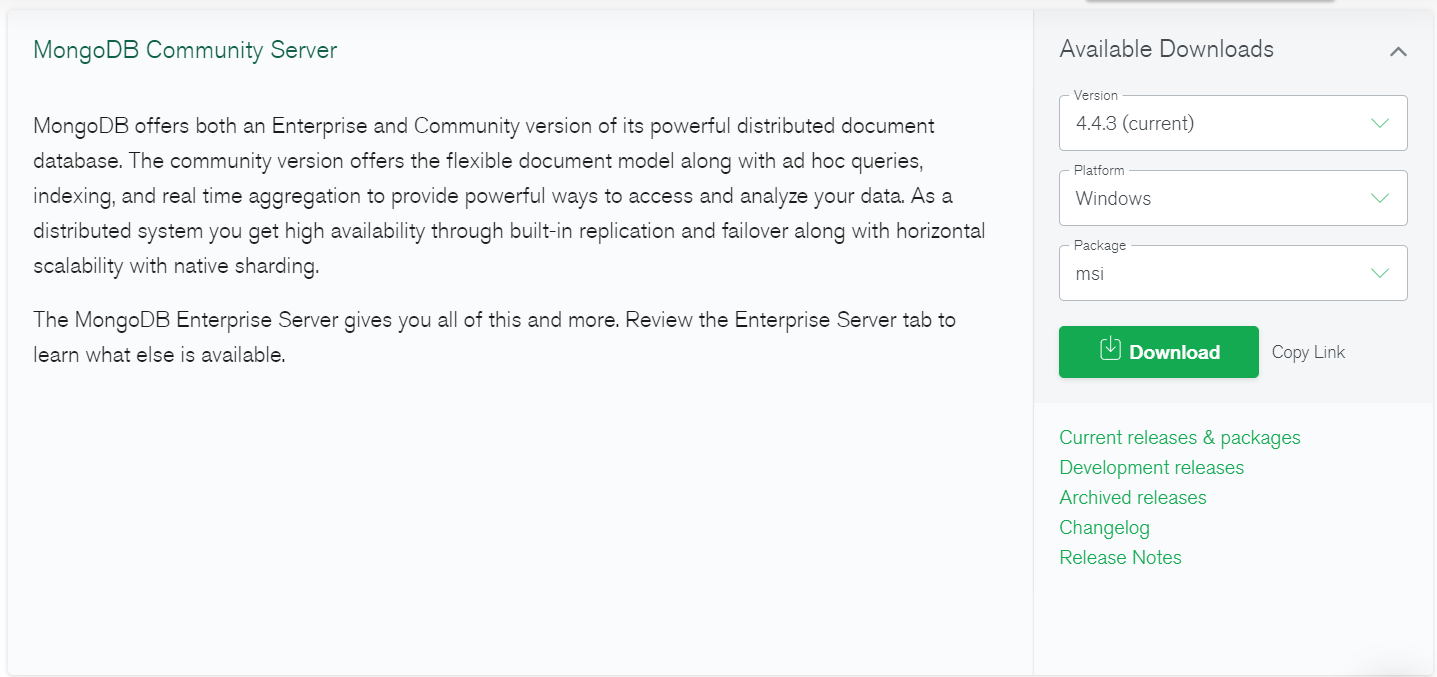 mongodb 공식 사이트에서 MongoDB Community Server를 다운받아 기본 설정으로 설치해줍니다.