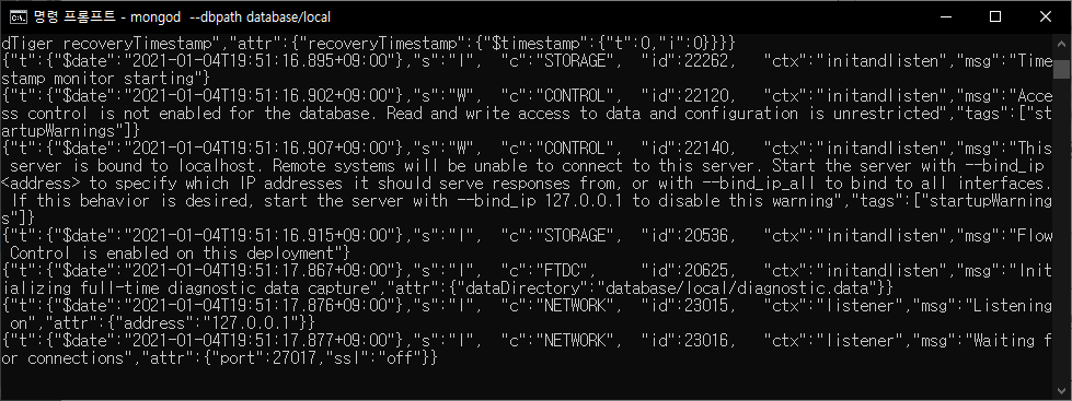 다음은 DB 생성 및 실행을 하겠습니다. 원하는 곳에 database 폴더를 생성하고 cmd 창을 키고 다음 명령을 실행합니다. (database 폴더로 이동, local은 DB이름)