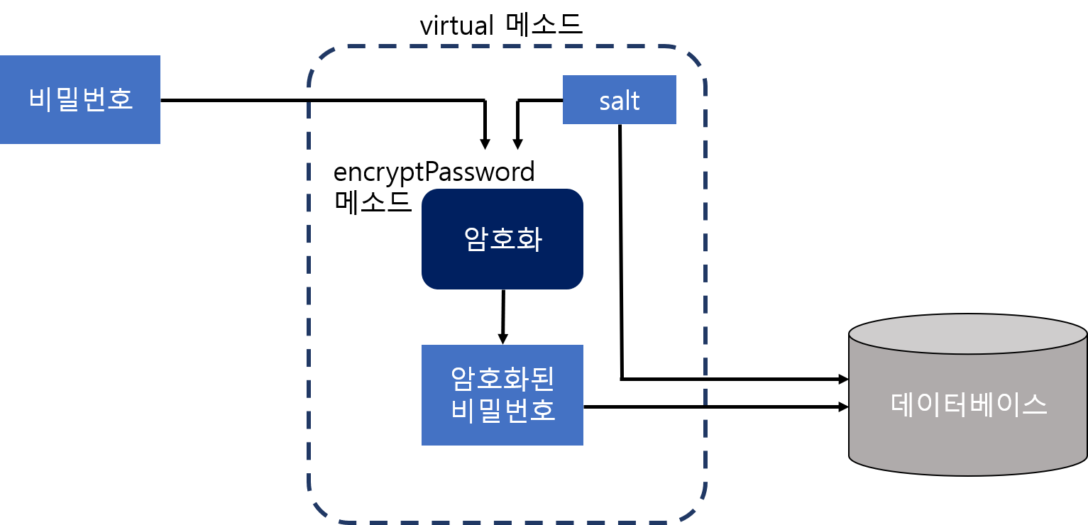 salt 값은 암호화를 위한 key입니다. 같은 비밀번호, 같은 salt를 encryptPassword 메소드에 입력하면 동일한 값을 반환합니다. 로그인할 때를 위해 이 salt값도 암호화된 비밀번호와 함께 저장합니다.