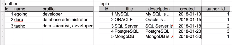 JOIN 문을 통해 topic 테이블을 부를 때 author_id만 가지고도 author 테이블의 name 칼럼과 profile 칼럼을 가져올 수 있습니다.
